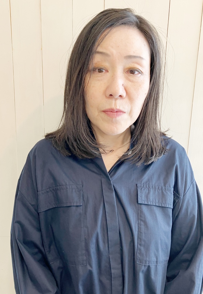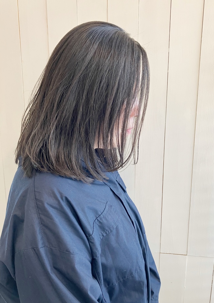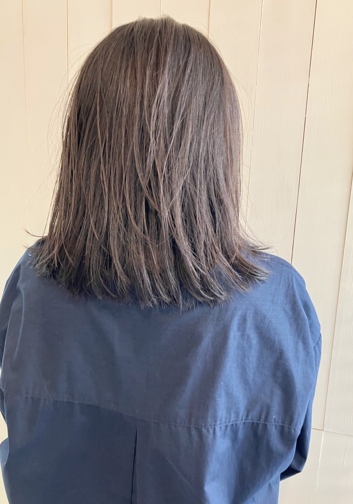 軽くはしたいとの事でしたが、あまりはねたりはしたくないとの事でしたのでレイヤーはほとんどいれない感じにしたのですが、前髪もつくらないミディアムスタイルでしたので重くなりすぎないように顔まわりにはすこ〜しだけレイヤーをいれさせてもらいました