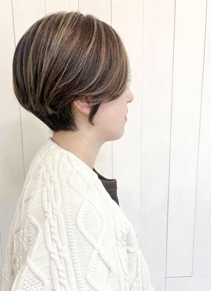 ショートスタイルにハイライトカラー、根本は明るめな白髪染めで白髪もしっかりとカバーされたお客様の仕上がり