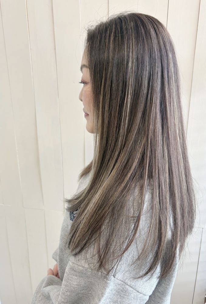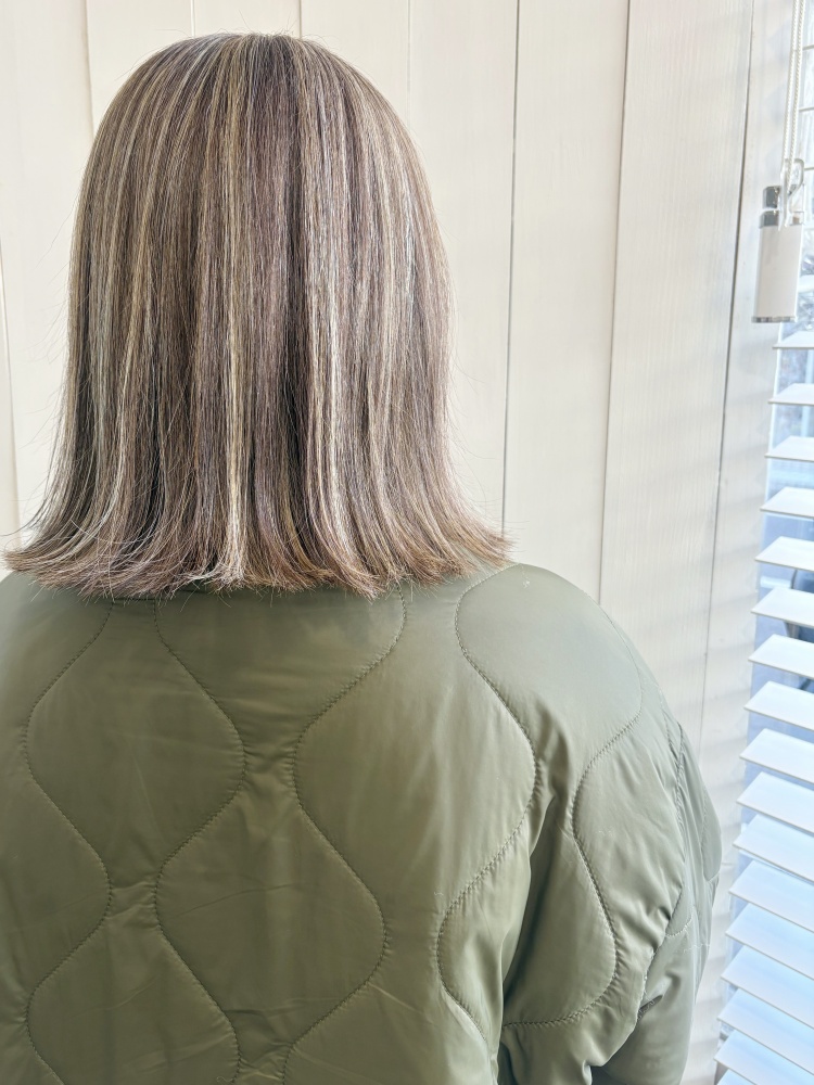 ハイライトカラーは、ベースの髪色より明るい色を筋状(スジ状)に入れて、陰影と立体感を出すヘアカラー技術です。髪に透明感や動きを演出し、根元から毛先まで細かく入れることで、白髪ぼかしや垢抜け感のあるスタイルが作れます。主にブリーチが使用されますが、ナチュラルな仕上がりを求める場合はブリーチなしも可能です。